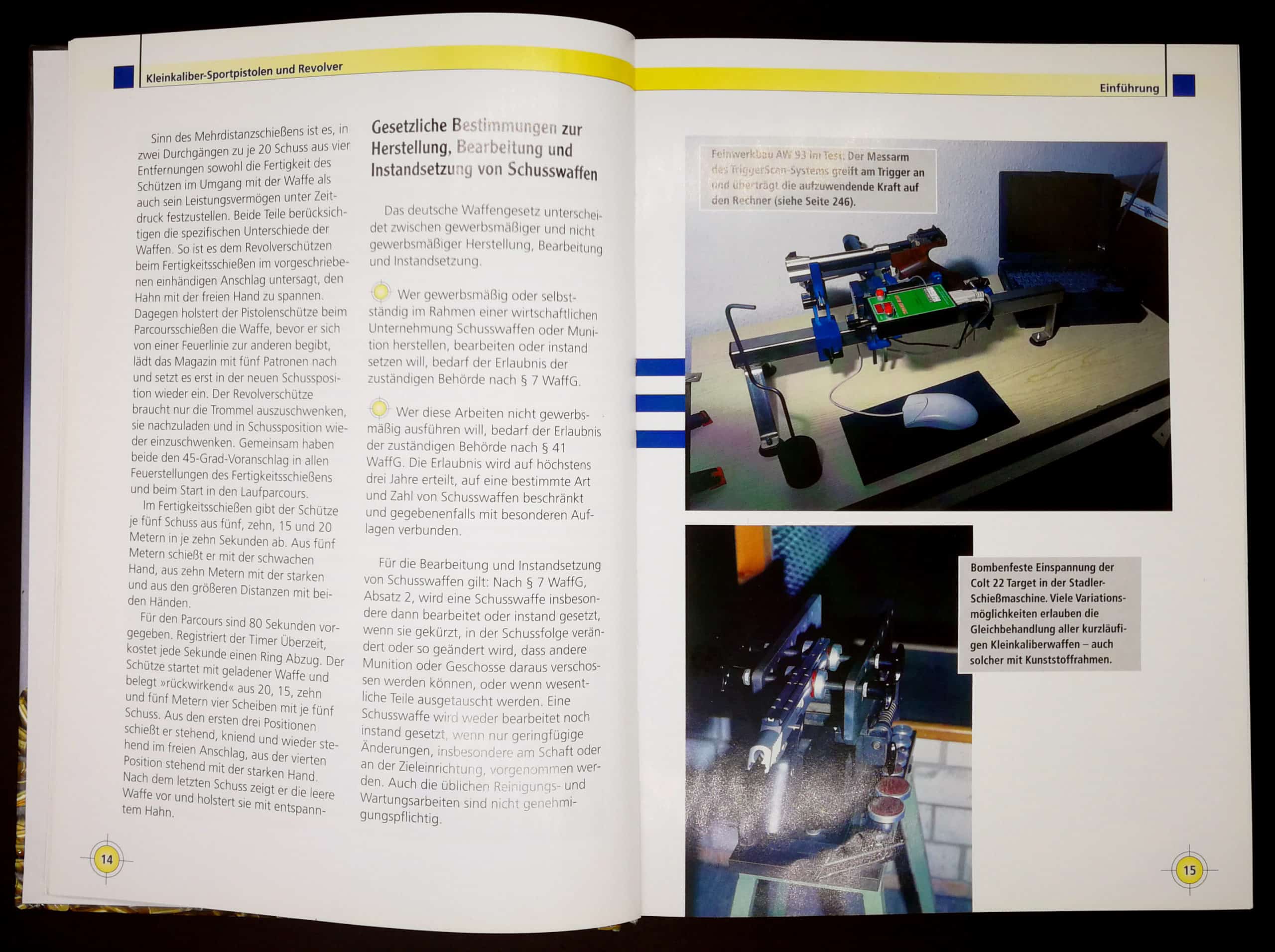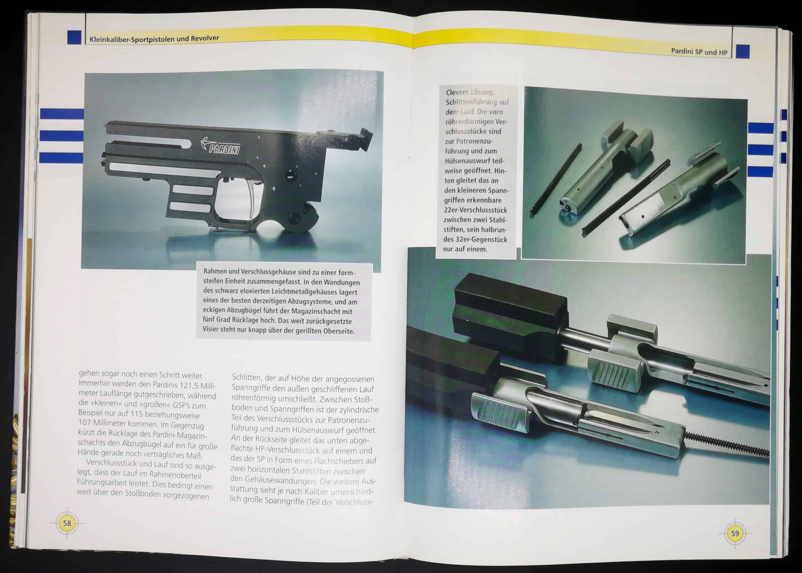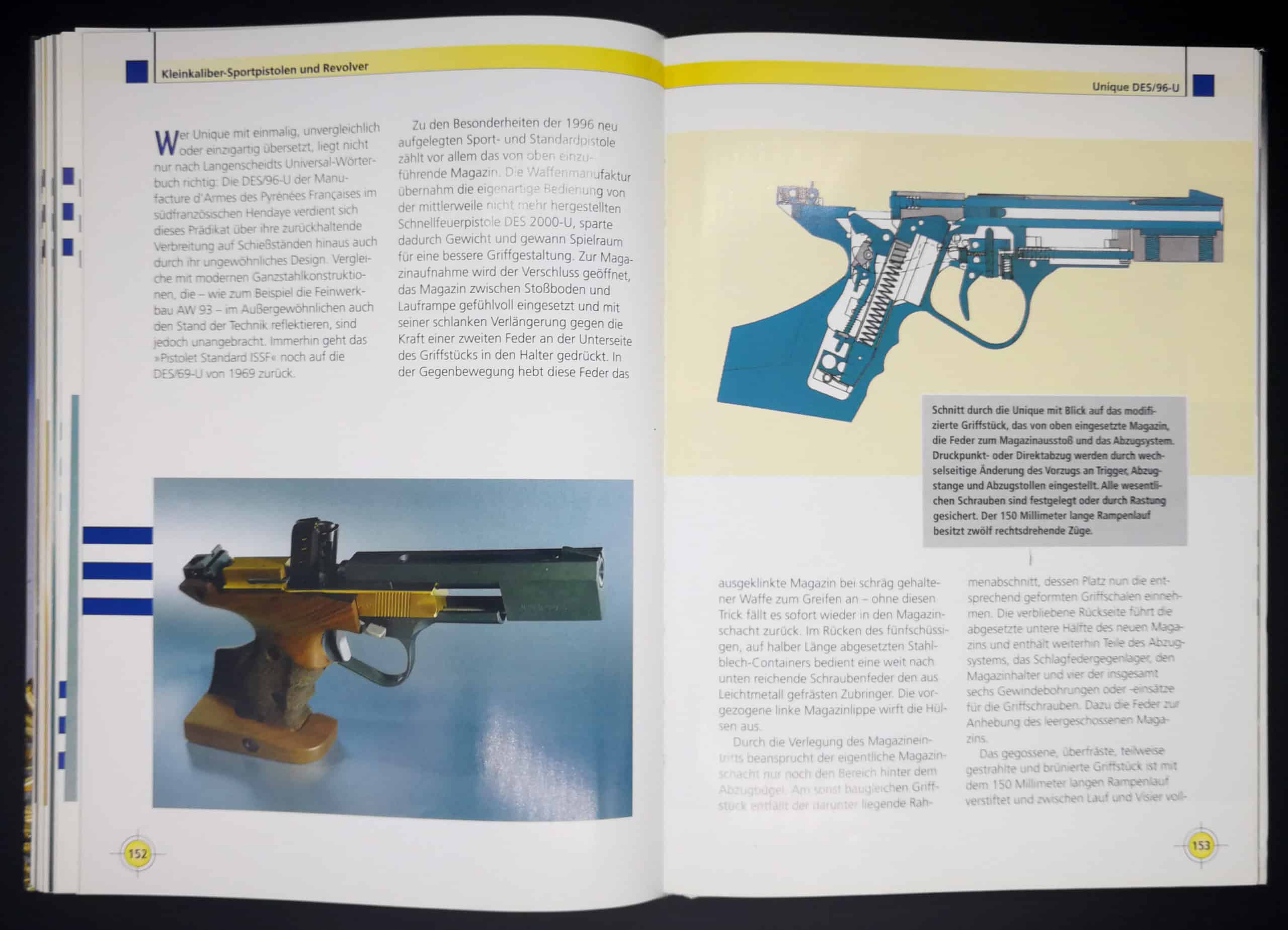 Das Buch konzentriert sich hierbei auf sportliche Besonderheiten von Deutschland, dies ist aus Schweizer Sicht aber vernachlässigbar, da die gezeigten Waffen auch bei uns in den jeweiligen Kategorien zugelassen sind. Ausnahme: Die Pardini GP und GPS zählt bei uns (und im ISSF) wegen dem Griff als Freipistole, und Waffen im Kaliber .22 short sind nicht ISSF-konform.